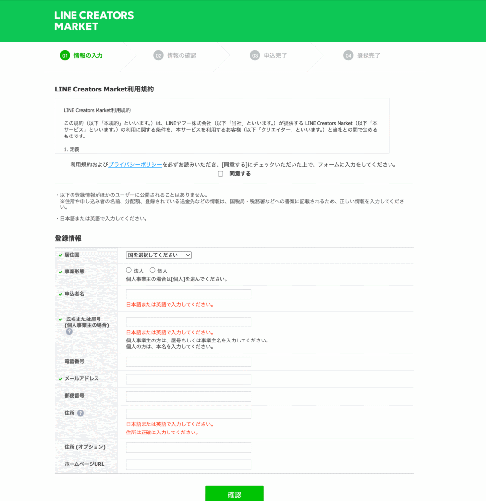 パソコンで申請する場合は、LINEクリエイターズマーケットTOP画面から「新規登録」→「スタンプ」へ進み、以下のような申請画面を埋めていきます。